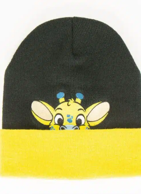 The beanie’s so soft and stretchy, it hugs your noggin’ just right, whether you’re a little kiddo or a big one who loves to bounce. It’s tough enough for chasin’ butterflies, jumpin’ in crunchy leaves, or cuddlin’ with your stuffies on cozy days. The black beanie’s like a dark, starry sky, and the giraffe shines like a tall, wobbly star who’s ready to dance!