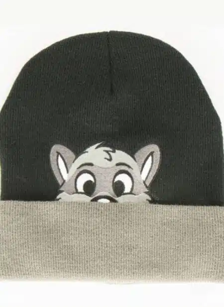 The beanie’s all soft and stretchy, so it fits your noggin’ just perfect, whether you’re a tiny kiddo or a big one. It’s tough enough for runnin’ through crunchy leaves, splashin’ in puddles, or snugglin’ with your stuffies on chilly days. The black beanie is like a dark, starry night, and the raccoon pops out like a sneaky moonbeam pal!