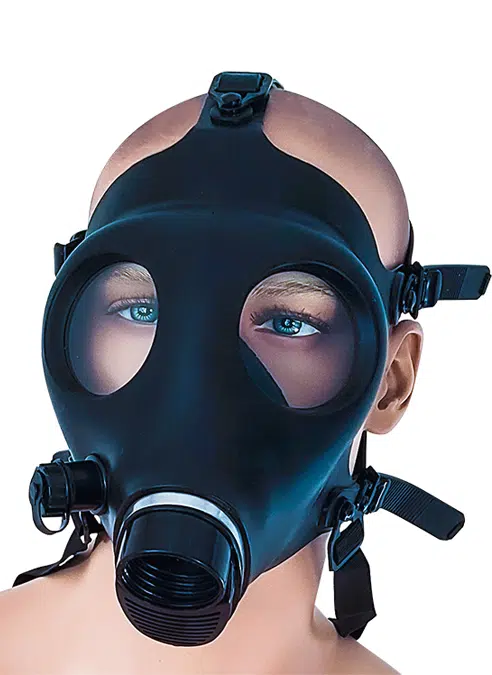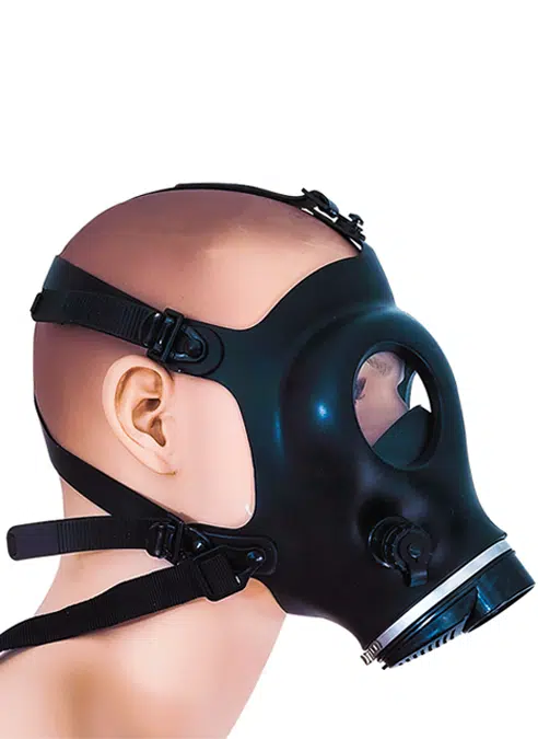 This gas mask will give you a sexy drone alien look. Great for rubber fetish and breath control play. This mask is based on the classic Israeli gas mask and is adjustable to size with the straps on the back of the head.