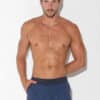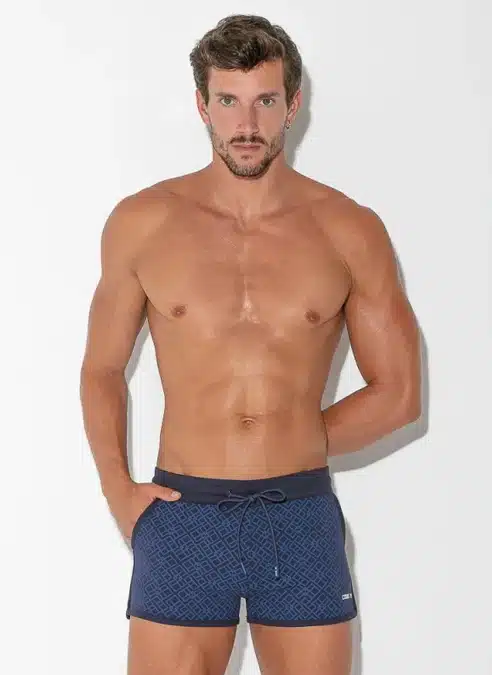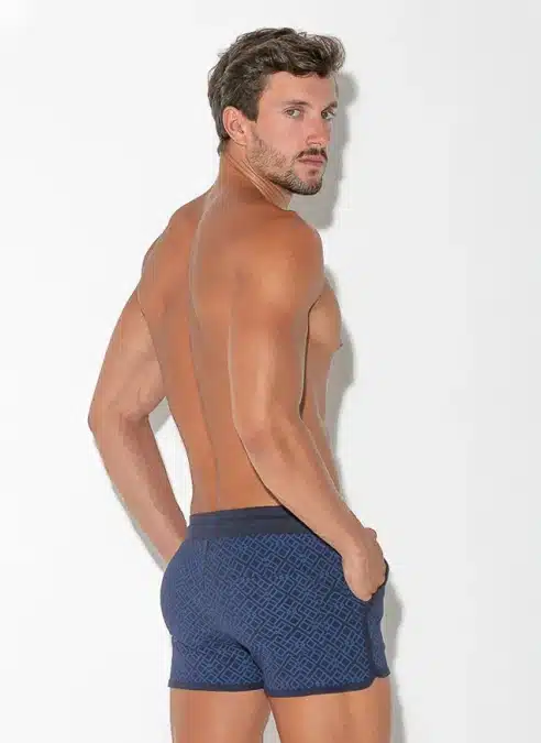 Slim fit printed mini short with stretch technology. Side stripe detail with ribbed finishing on waist and a 2” inch /5cm inseam. Our iconic logo in high frequency on thigh.