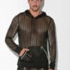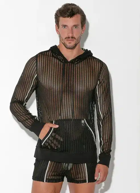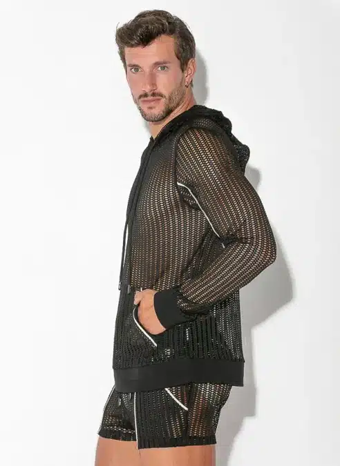 Hoody made of the finest openwork jacquard fabric. Contrast piping details on hood, sleeve, and pocket. Ribbed finishing on sleeves and waist.