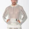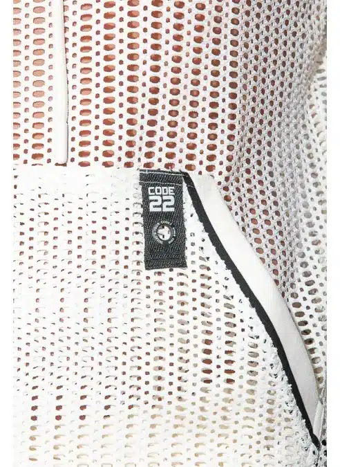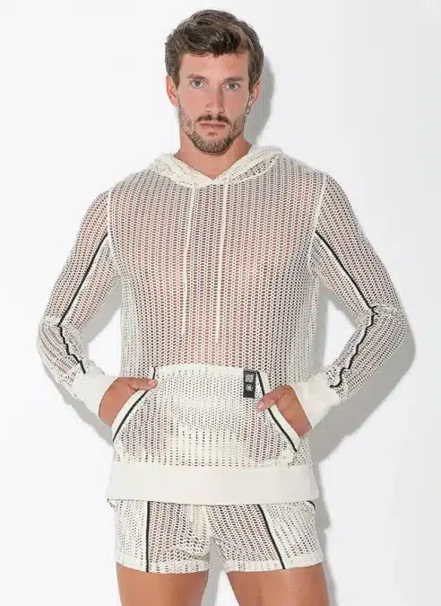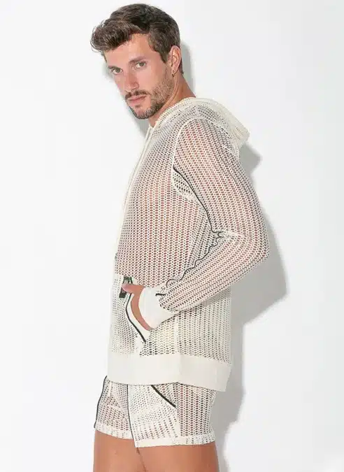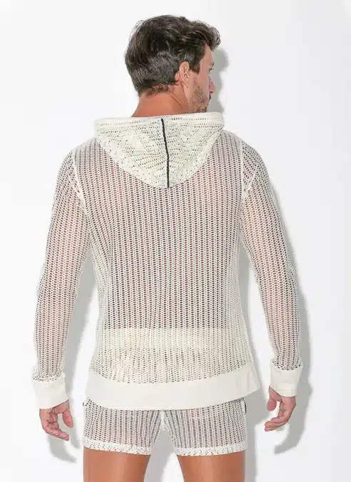 Hoody made of the finest openwork jacquard fabric. Contrast piping details on hood, sleeve, and pocket. Ribbed finishing on sleeves and waist.