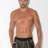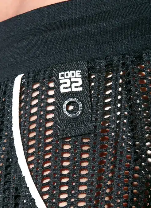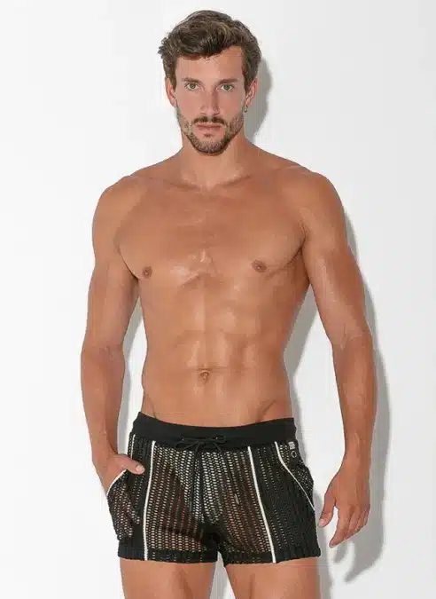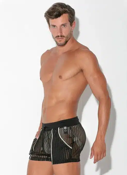 Slim fit short made of the finest openwork jacquard fabric. Ribbed finishing on waist and contrast piping detail on front and pocket. High frequency logo tab.