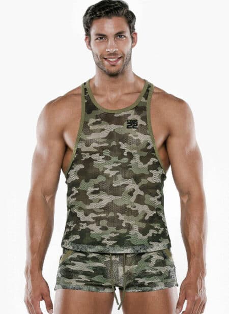 Open armhole tanktop made of finest mesh fabric. Razorback and a high frequency logo on chest.