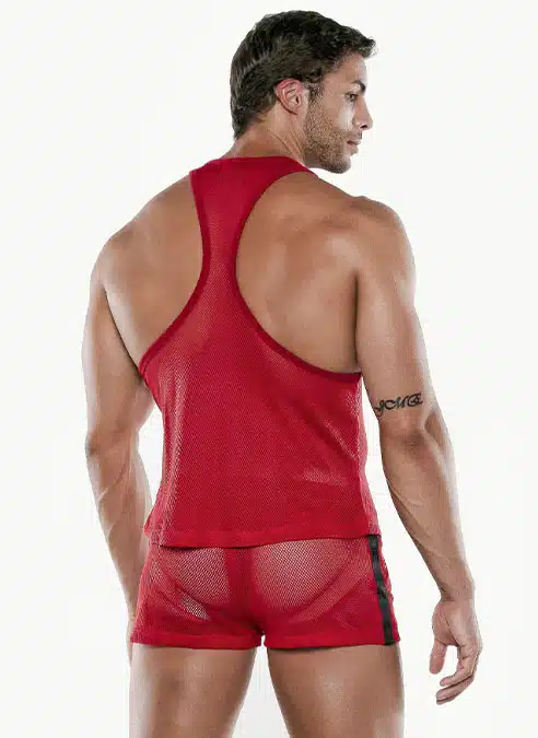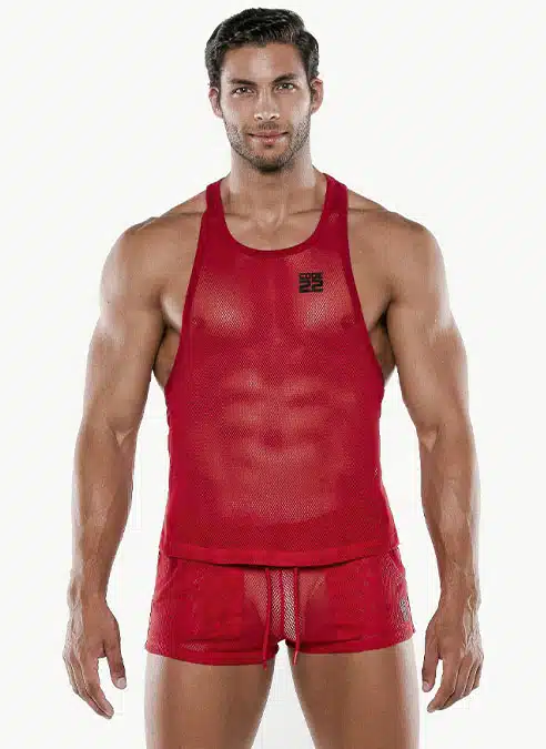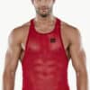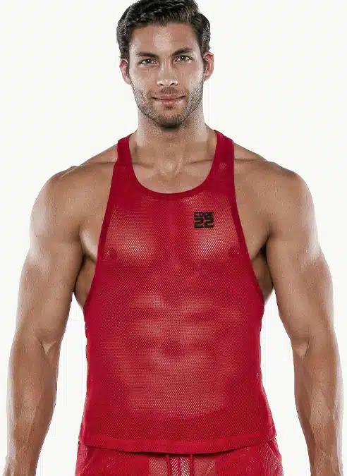 Open armhole tanktop made of finest mesh fabric. Razorback and a high frequency logo on chest.