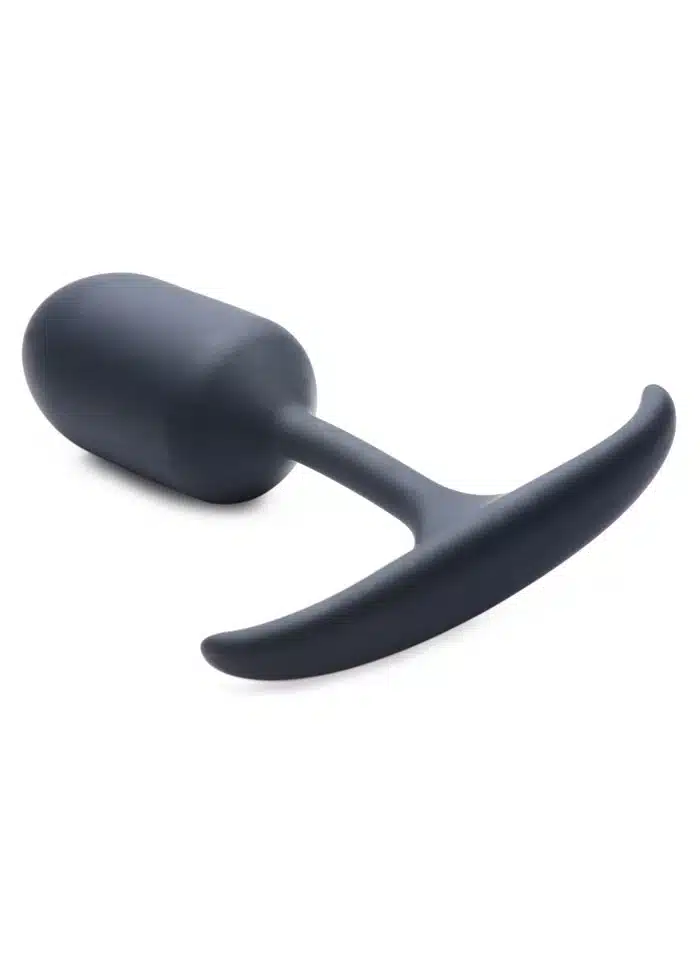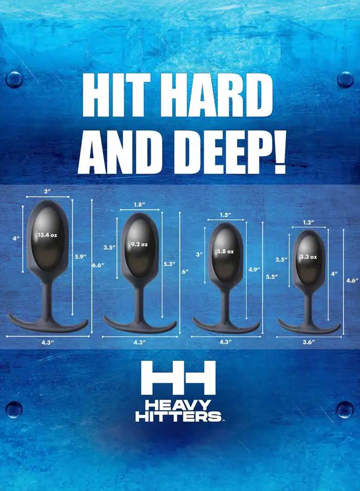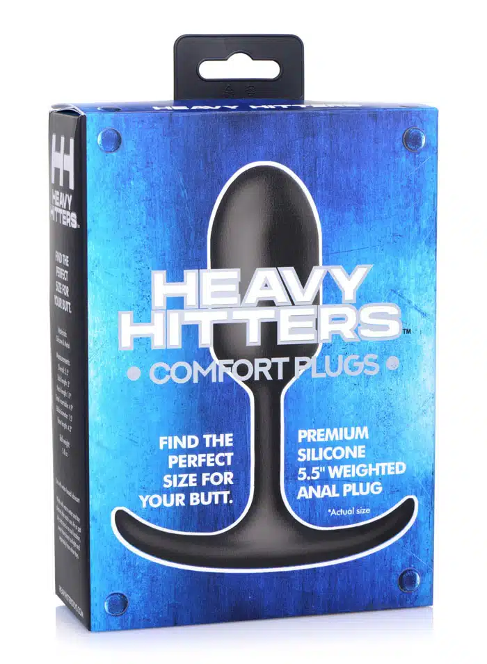 These comfortable weighted butt plugs hit hard and deep! Heavy Hitter Comfort Plugs are crafted for a fulfilling backdoor fill without the discomfort of larger toys – the round and tapered body inserts easily while the narrow neck flexible base move with your butt cheeks so you can play for extended sessions without discomfort. Made with premium, silky smooth silicone for a luxurious velvety texture your ass is gonna love! Phthalate free, non-porous, and body safe for a worry free anal experience – use with water based lubes only to prolong the life of your Heavy Hitter. Insert and feel the satisying weight of this comfy anal toy: The gratifying 5.8 ounce metal weight found in this Medium Heavy Hitter provides a satisfying downward pull with your every movement, while also providing a solid core for you to squeeze on. Perfect for warming up the backdoor – plug your lovers booty and warm up their backdoor as you go about the home in preparation for the main anal event of the night! Measurements : Overall length 5.5 inches, bulb length 3 inches, neck length 1.9 inches, total insertable length 4.9 inches, bulb diameter 1.5 inches, base length 4.3 inches. Ball Weight : 5.8 ounces Materials : Silicone and metal Color : Black