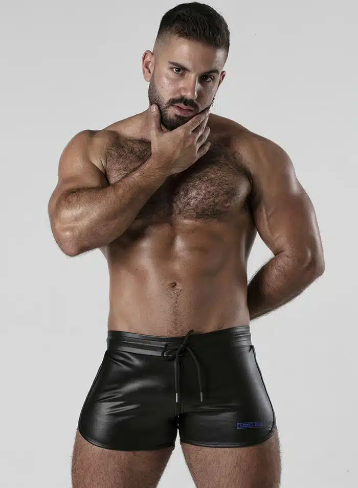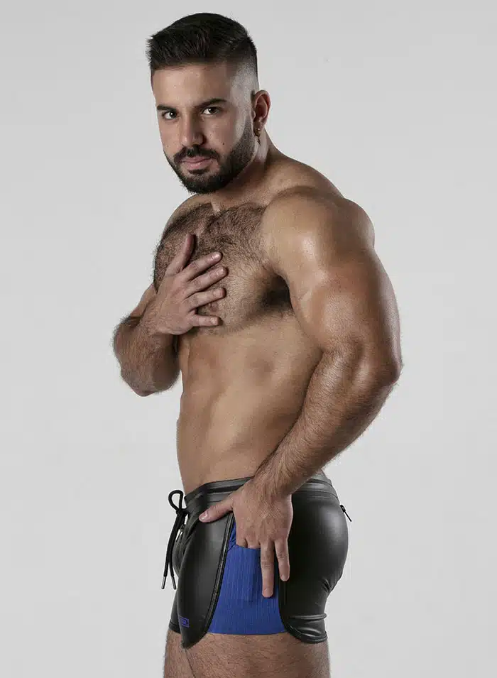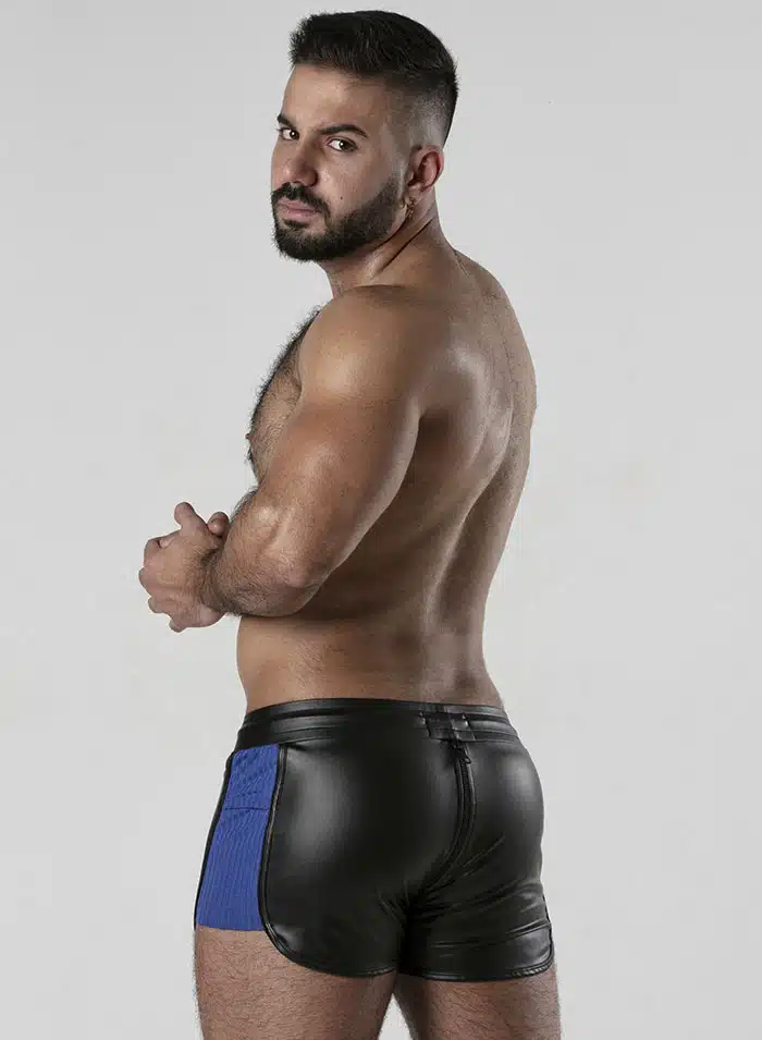 Short with a 3 way zipper for both front and back opening at the same timeM made of the finest leatherette fabric. Contrasting rib side band with hidden cargo pocket to finish off the look and hide your essentials.
