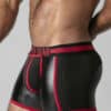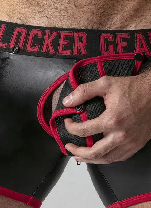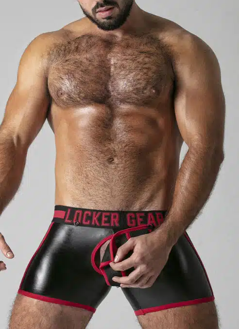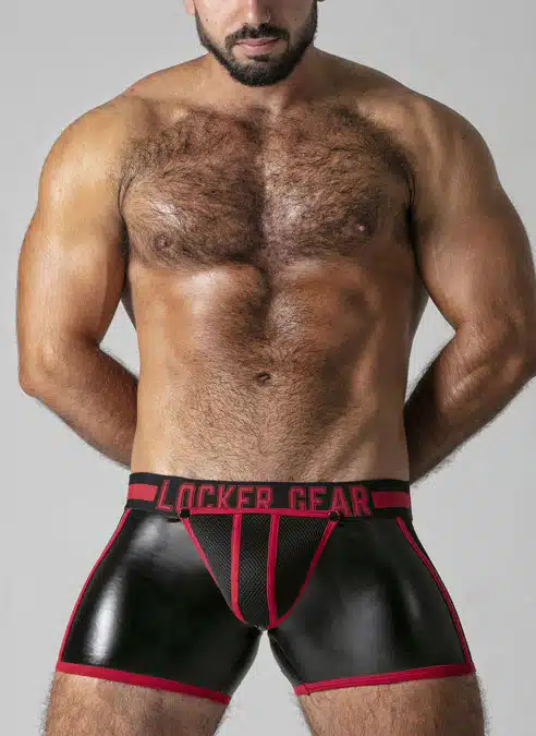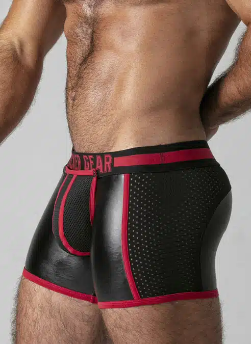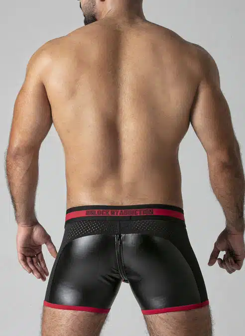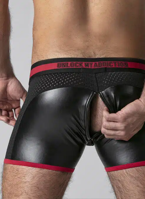 These low cut, tight shorts are made of a stretchy PU, leatherette fabric with a removable, 3D mesh pouch, mesh panels and a back zip.