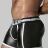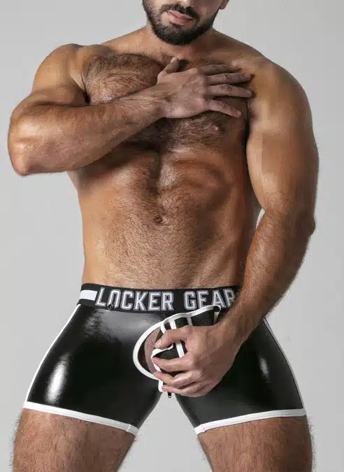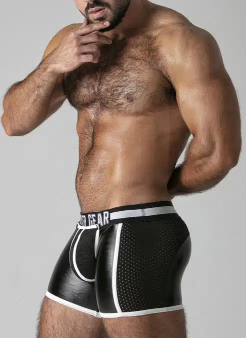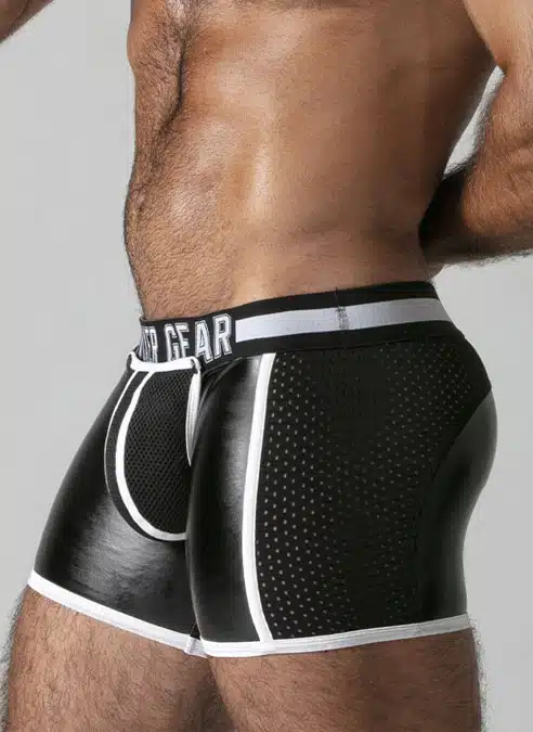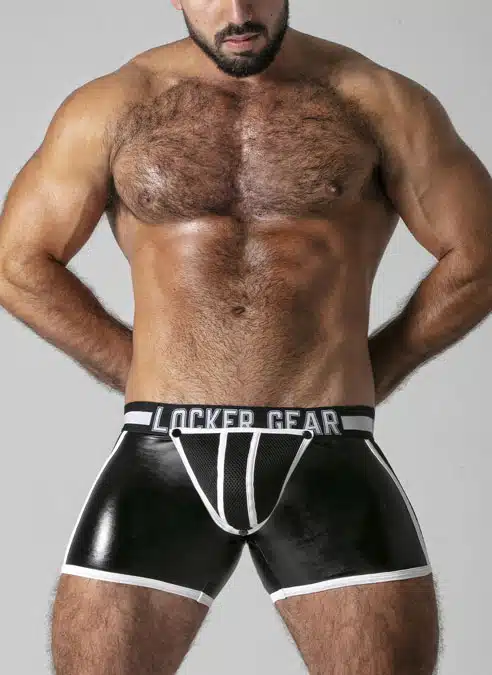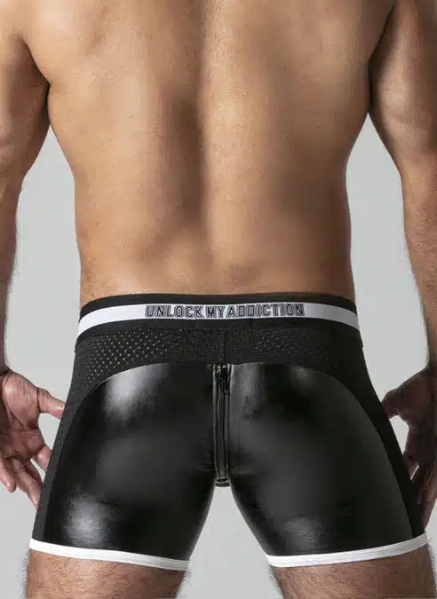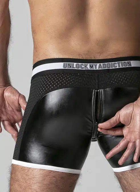 These low cut, tight shorts are made of a stretchy PU, leatherette fabric with a removable, 3D mesh pouch, mesh panels and a back zip.