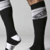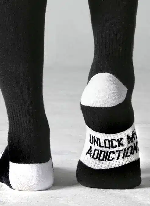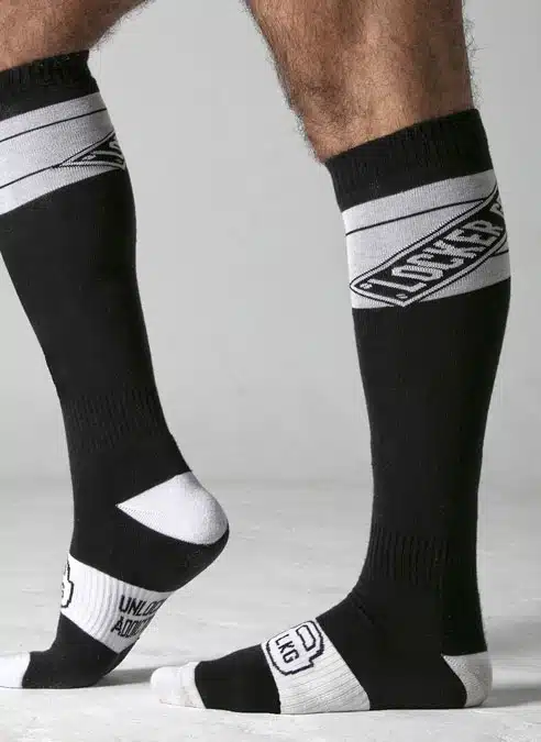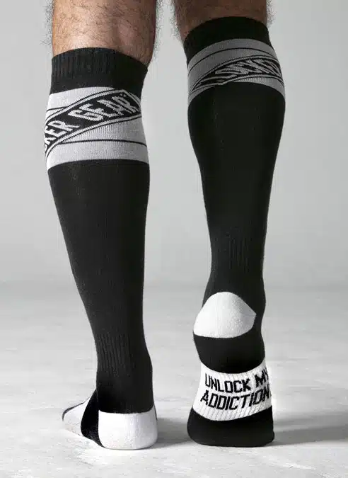 Knee high fetish socks in the classic Locker Gear colors. With contrast details, padlock and ‘Unlock my addiction’ logo on the foot.