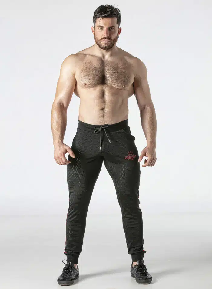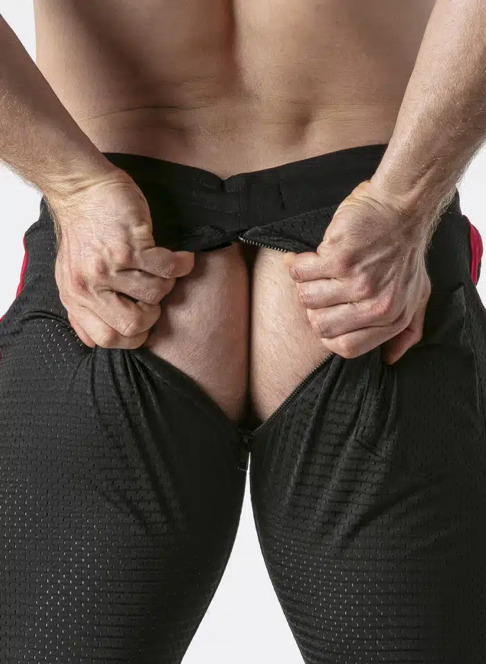 Jogger with hidden back zipper for easy access to that ass. Made of the finest breathable mesh fabric with ribbed finishing on waist and bottom and contrasting pinhole side bands. It has two front pockets and one back pocket for all your party essentials.