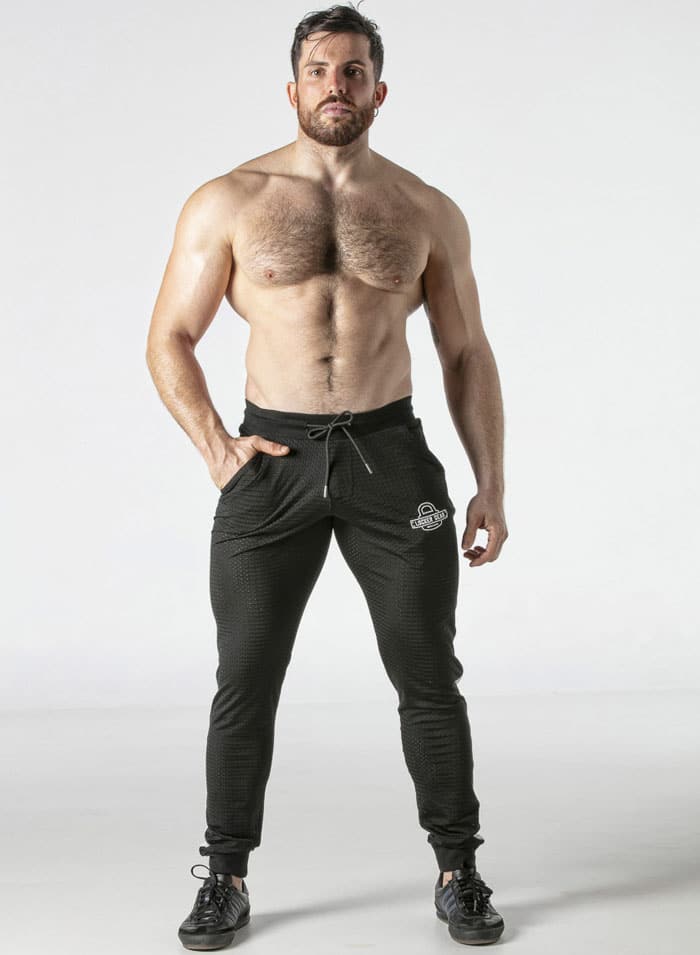 Jogger with hidden back zipper for easy access to that ass. Made of the finest breathable mesh fabric with ribbed finishing on waist and bottom and contrasting pinhole side bands. It has two front pockets and one back pocket for all your party essentials.