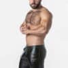 Cargo short made of the finest perforated leatherette fabric with hidden back zipper opening. Functional zip on front fly, D-rings inside the waistband to attach your body harness and leatherette details on waist and saddle.