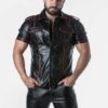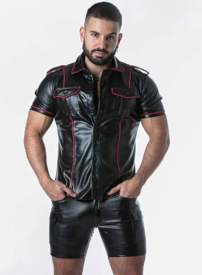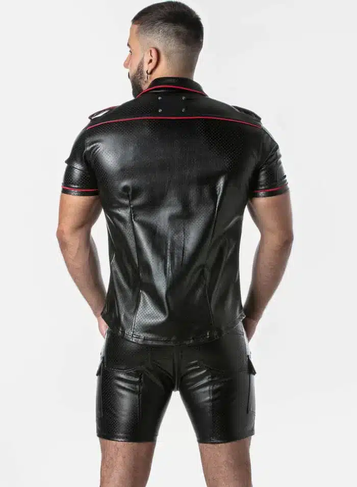 Short sleeve shirt made of the finest perforated leatherette with red contrast piping.