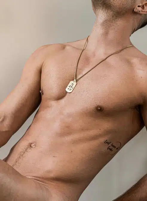It has laser engraved branding at the back of the tag and on the closure of the 65 cm (26″) rounded box chain.
