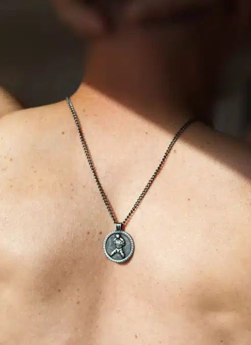 A pendant inspired by Roman coins, featuring an sexy image for showing off your appreciation for the art of bondage. Crafted from stainless steel with electro plating for vintage look.