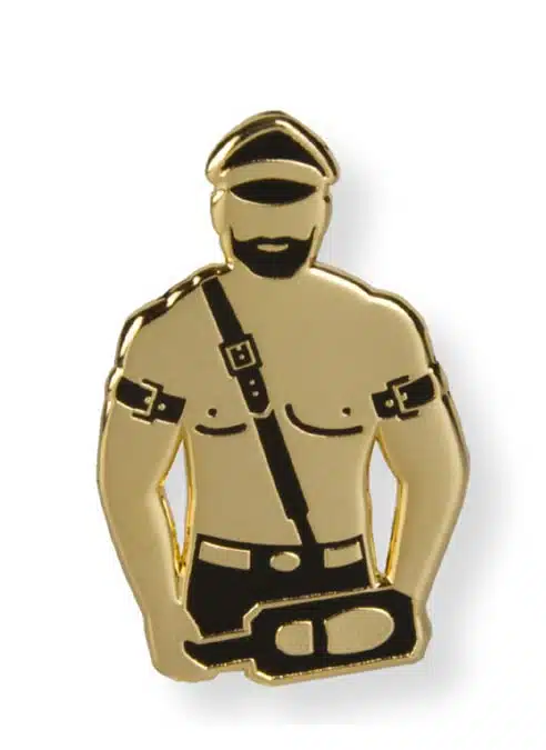 Hard enamel pin in matt black and gold.