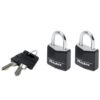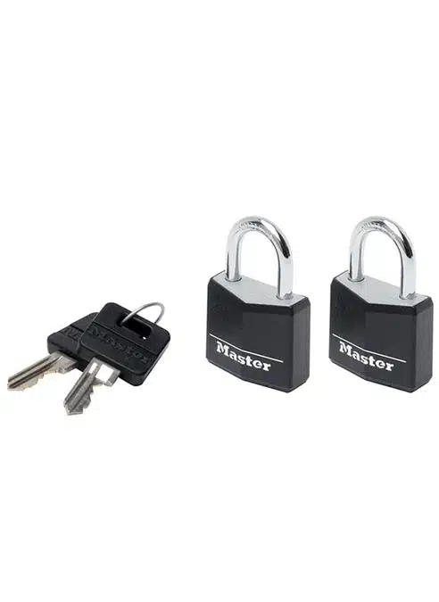 The MasterLock Black Covered Solid Aluminum Padlock features a 30 mm wide covered solid aluminum lock body that is durable and resists corrosion. The 5 mm diameter shackle is 18 mm long and made of hardened steel, offering extra resistance to cutting and sawing. The 4-pin cylinder prevents picking and the dual locking levers provide resistance against prying and hammering.
