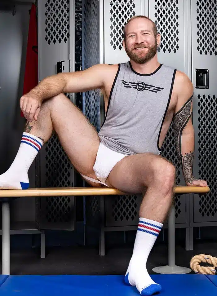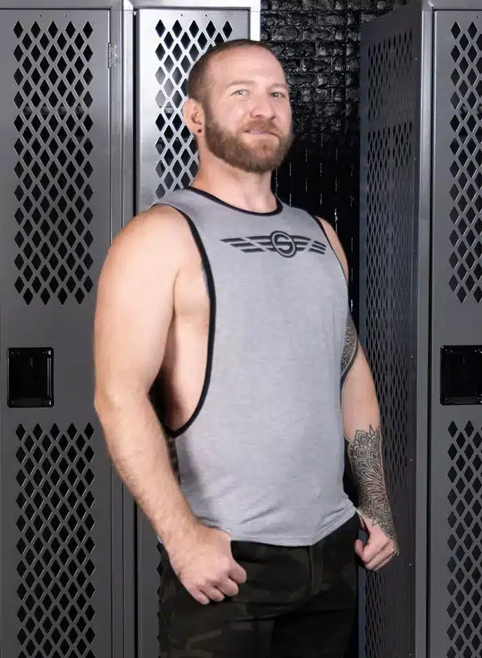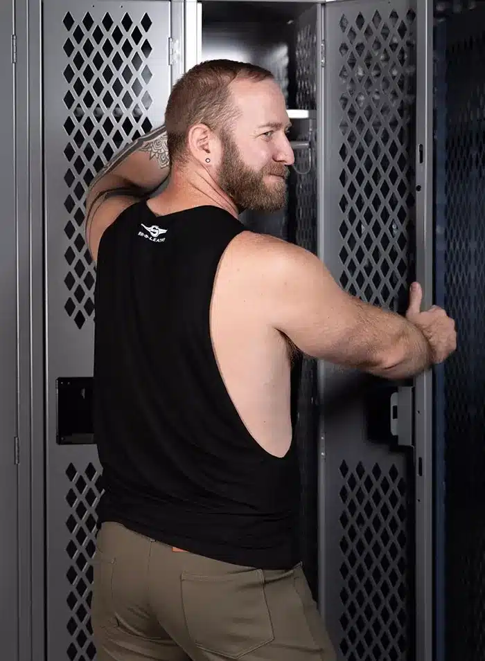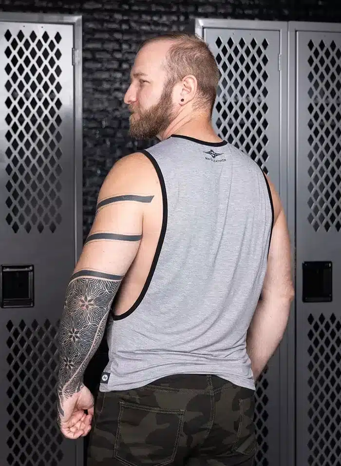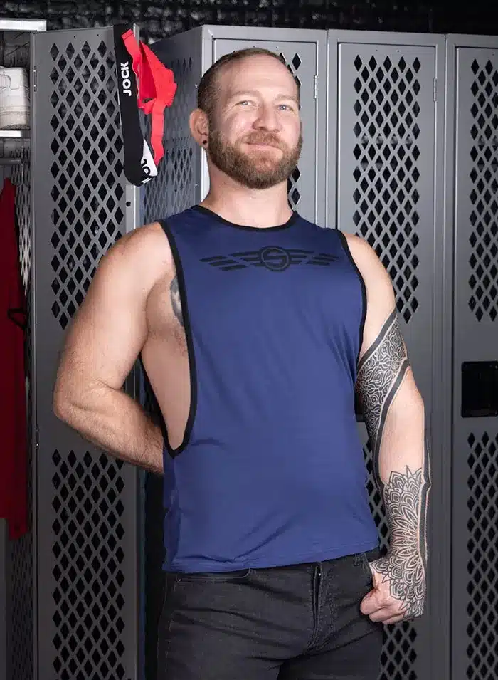 A stretchy butcher-cut tank for getting into trouble at the gym or cruising the streets. Pair it with denim, gym tights, or some ass-hugging basketball shorts.
