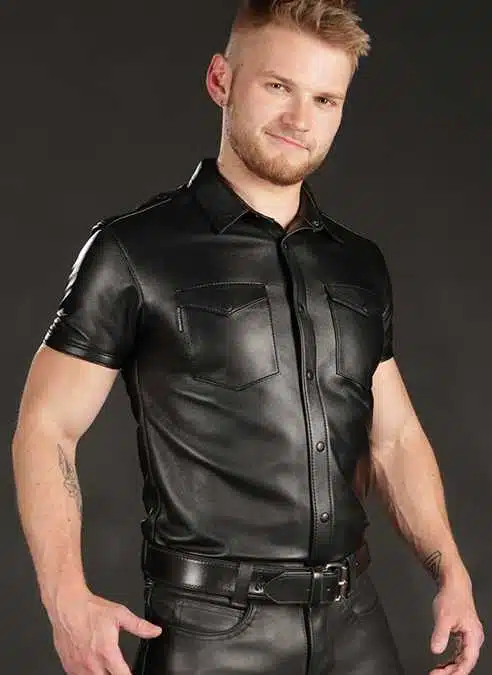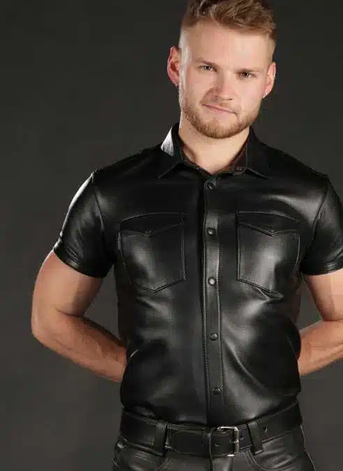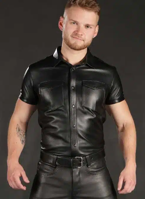 This shirt is really one of the most comfortable leather shirts you will ever wear. A classic design in a great new material from Mr. S Leather.