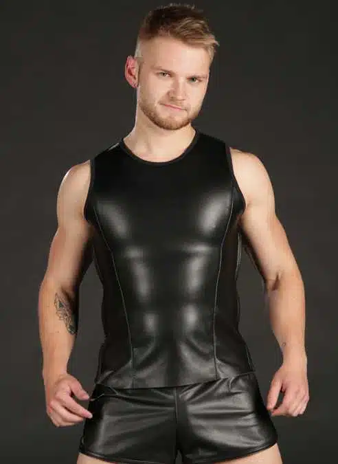 This tank is constructed with silky smooth, lightweight, lambskin leather. Two side zippers make getting this garment on easy, while keeping the front clean and simple so your chest, shoulders, and arms are the main attraction.