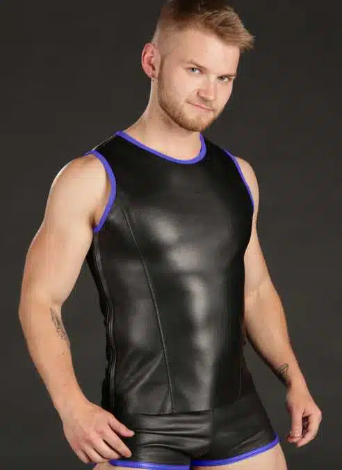 This tank is constructed with silky smooth, lightweight, lambskin leather. Two side zippers make getting this garment on easy, while keeping the front clean and simple so your chest, shoulders, and arms are the main attraction.