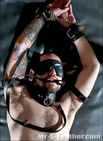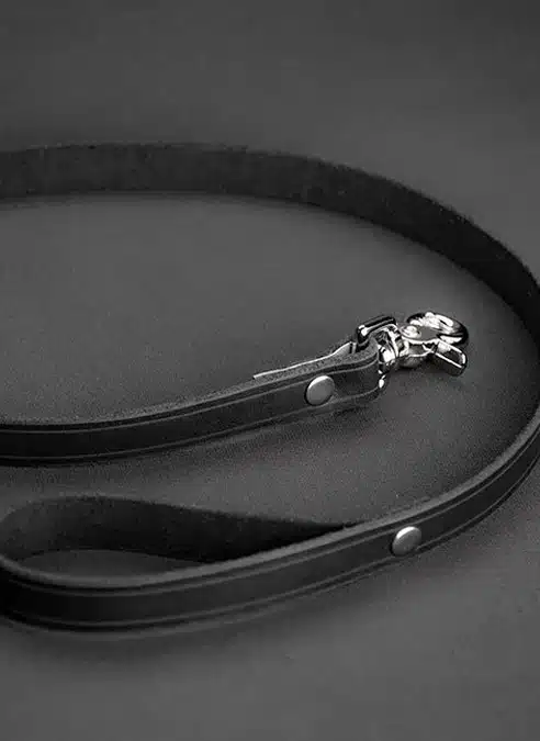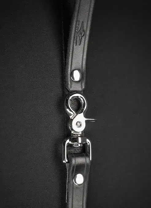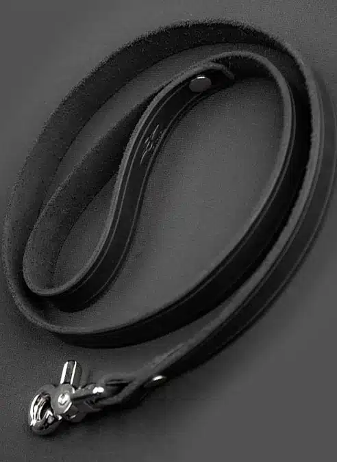 A 32 inch ~ 81 cm all-leather leash with a wrist strap and a strong metal trigger clip.