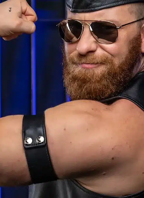 1 ¾ inch ~ 44,5 mm wide all leather bicepbands with snap closures. Sized for arms.