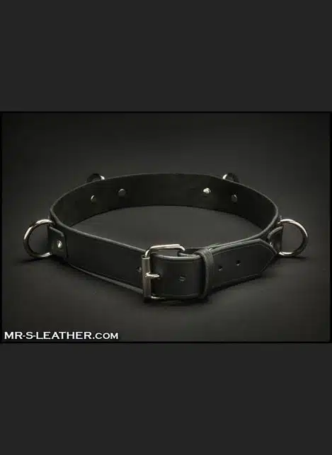 Great for wearing on jeans or for use in a scene. 4 strong ‘D’ rings circle this 1 ¾ inch ~ 4,5 cm wide leather belt with roller buckle.