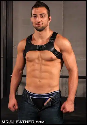 Inspired by the armor of the Greek and Roman warriors, this harness will have you looking like a muscle god! Constructed in the San Francisco production department, this piece is made of a heavy latigo leather. It starts out stiff but as you wear it, it will conform to your body. This is definitely a piece that gets better with age.