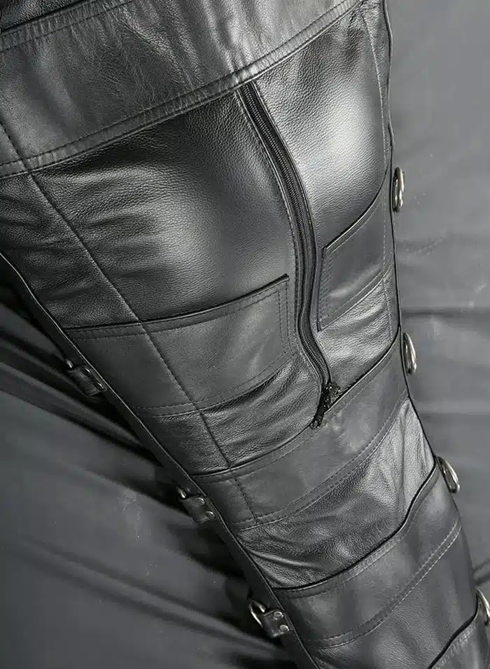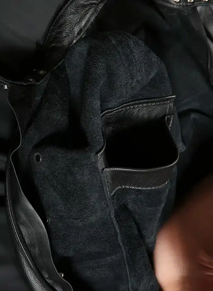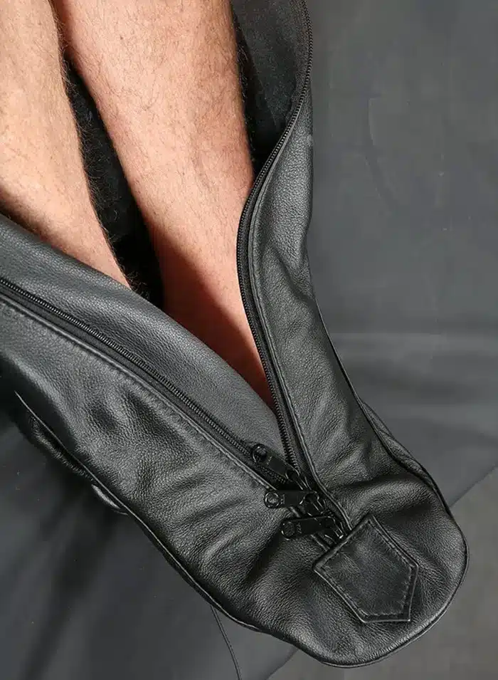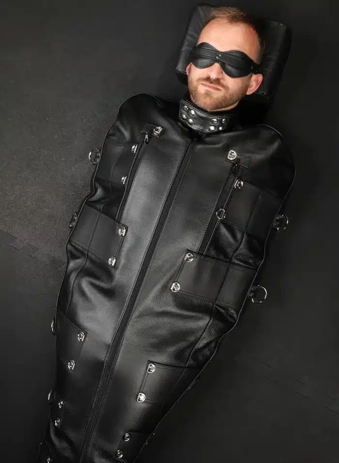 The Deluxe Leather Sleepsack covers the entire body from the neck to the feet. When you are zipped into the Leather cocoon and then the laces are pulled over the zipper, you are squeezed tightly and evenly the entire length of your body. The feeling is one of total helplessness. With your arms and hands secured inside the Inner sleeves at your sides, you can’t reach or touch anything.
