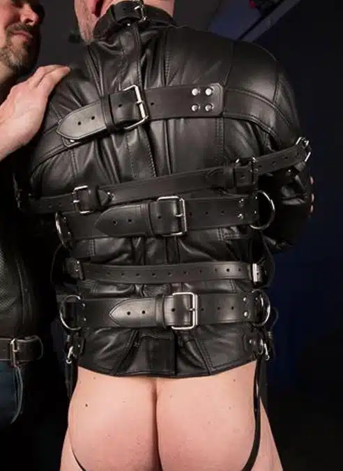 This classic Fetters USA design has received a brand spanking new re-design. Mr. S modified our construction process for a better, more comfortable style and fit. Velcro was added in the back to make getting into the straitjacket simpler. The padding around the arms was moved to really focus on the elbow area so you can comfortably stay locked in. Additionally they’ve moved the placement of the leg straps. Now these straps frame your ass like a jockstrap so you get a better look and it feels great too. The belting around the piece got updated to 2” wide belts. This makes it easier to cinch it on and gives an even more secure, tight fit for the wearer.