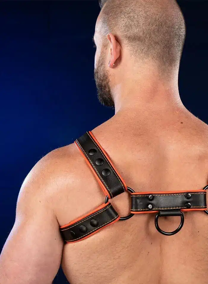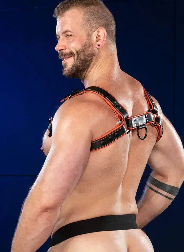 The Hardline Bulldog Harness brings a fresh look the the Mr. S Leather arsenal – bold stitching with sleek black hardware and sturdy leather piped with a splash of color will make sure that the guys at the bar notice you’re wearing the best of the best.