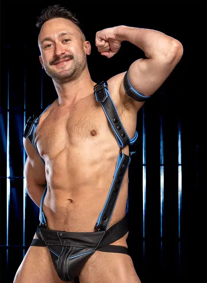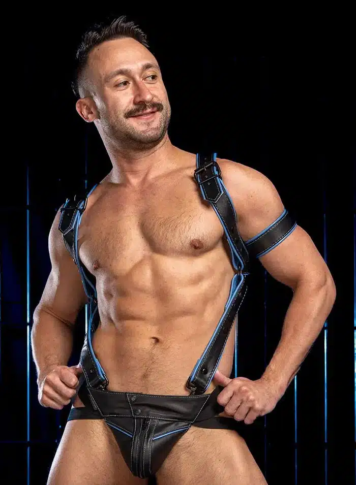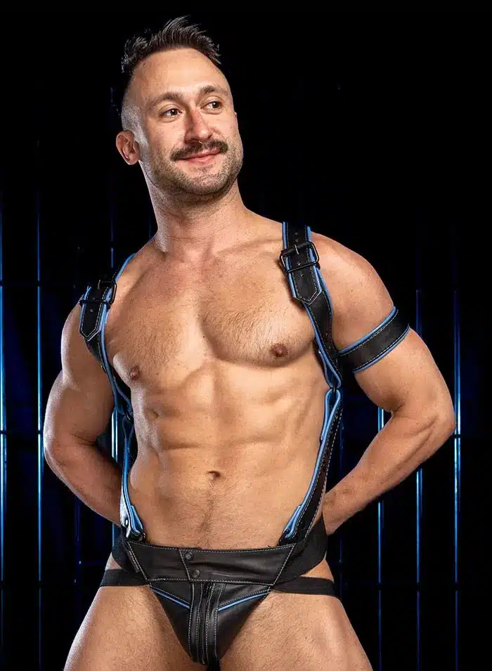 2″ black O-rings connect the upper harness straps to two suspenders that clip into your front belt loops or the d-rings in the matching Hardline Jockstrap and many of the other Mr. S leather jockstraps. Adjustable snaps make it easy to get a tight, trim fit that highlights your abs and cum gutters.