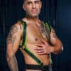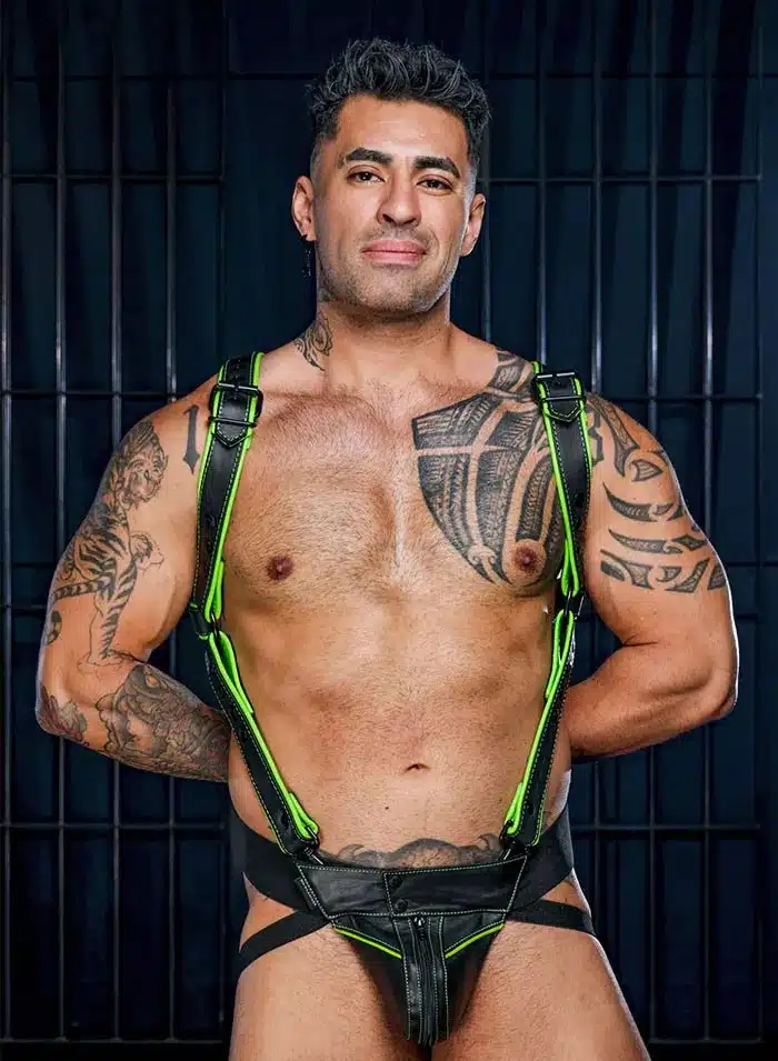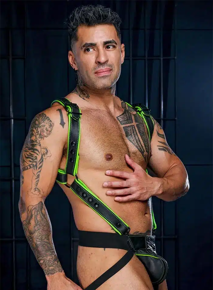 2″ black O-rings connect the upper harness straps to two suspenders that clip into your front belt loops or the d-rings in the matching Hardline Jockstrap and many of the other Mr. S leather jockstraps. Adjustable snaps make it easy to get a tight, trim fit that highlights your abs and cum gutters.