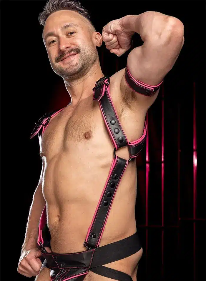 2″ black O-rings connect the upper harness straps to two suspenders that clip into your front belt loops or the d-rings in the matching Hardline Jockstrap and many of the other Mr. S leather jockstraps. Adjustable snaps make it easy to get a tight, trim fit that highlights your abs and cum gutters.