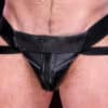 Each Hardline Jockstrap is built with supple garment leather, high-contrast stitching, black hardware, high quality black elastic banding, and a lambskin internal lining that will feel great on your junk when you’re getting groped at the club.