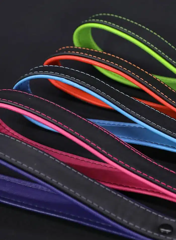 The Hardline Short Leash brings a fresh look the the Mr. S Leather arsenal – bold stitching with sleek black hardware and sturdy leather piped with a splash of color will make sure your sub and/or pup knows you mean business.