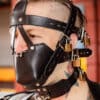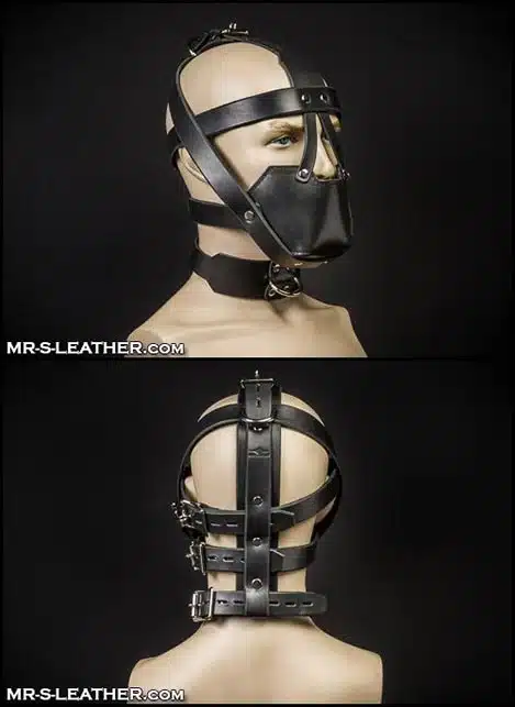 One of the most effective and sexiest looking head muzzles they have ever designed. Five, one inch wide straps circle the head, enabling you to adjust and tighten this piece to fit just about anyone’s head. This is our padded version which includes a heavily padded mouthpiece for comfort, the fitted mouth piece cups the jaw and covers the mouth, muffling any sound your boy might try to make. The collar strap comes with a front neck D-ring that’s perfect for attaching a leash.