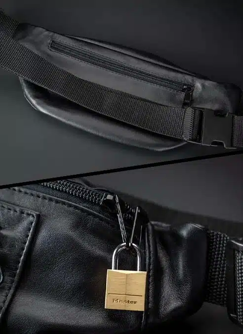 - One large main pocket – can store larger items like your phone, small to medium sized lube bottles, extra cock rings, or even a tank top if you need some more skin-on-skin action. This section features two zipper heads so it is easy to open whether you’re right or left-handed. Bonus feature: you can insert a small lock between the two zippers to keep your goods secure. Lock not included.
