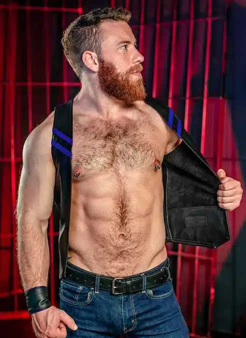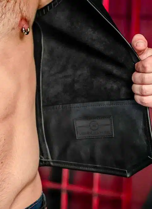 The three panel back adds a nice taper so you’ll be looking your best from every angle! Two internal pockets give you a place to store your stuff. A hot look that’s perfect for street fairs or any sexy leather event you’re attending!