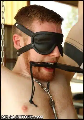 This all leather blindfold is patterned after the satin sleeping masks used on International flights, but with special sexy modifications.