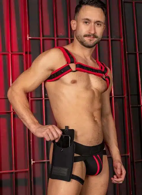 Based on the ever popular leather Jock Holster Harness. There’s room for your phone, cards, cash, brown bottle and more.