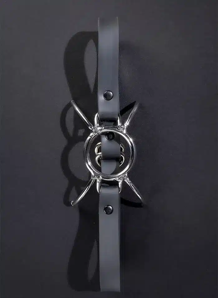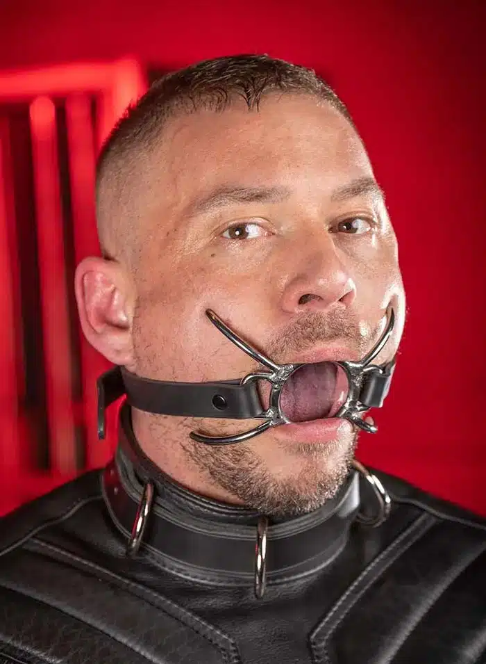 It first appeared on Bound Gods and got us so hard we set our craftsmen out to recreate it. This piece is constructed just like the original- not like some of the knockoffs you might see out there. The stainless steel center ring is 2 1/8 inches tall and has a 1 5/8 inches inside diameter, the perfect size for feed your piss and cum to the boy. He will be begging to suck your dick but this gag will keep YOU in control- all he’ll get is a little taste (and a lot of sloppy drool). The four side prongs give that hot sexy spyder look and the fully adjustable D-ring strap allows you to get that perfect fit.