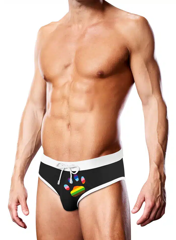 Show off your pup identity in summer with this Pup Paw swim brief, made by Prowler. Available in black and white and 4 sizes.