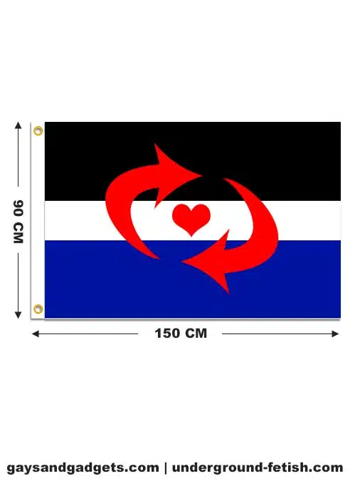 The flag consists of the same colors as the traditional Leather Pride flag. The arrows in the middle around the heart, indicate the fluid motion of switching between roles.
