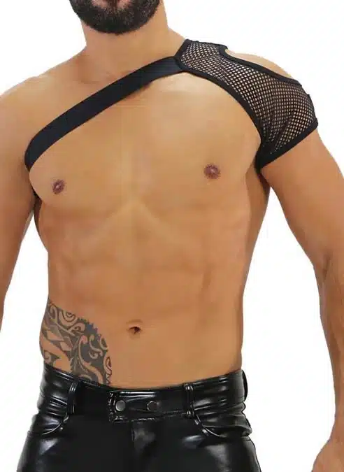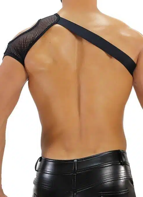 This black mesh shoulder harness gives a sexy feel when worn with another mesh garment like briefs, jockstrap, boxers or tank top. Perfect for a sex session or to go clubbing.