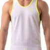 Light weight tank top in a polyester mesh fabric, with neon colored details and trim.
