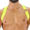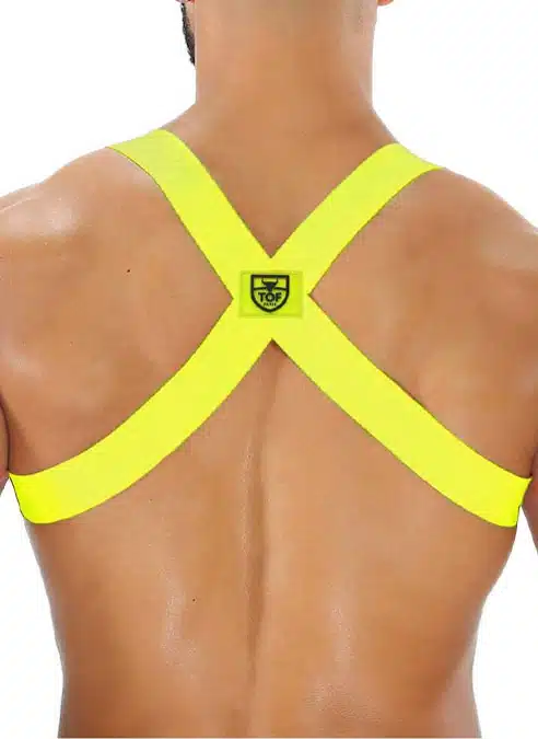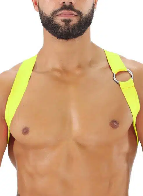 This elastic harness is a classic item to play at home or when out clubbing. Consisting of a 3 cm wide elastic strap crossed in the back, and a metal ring detail on one side. This harness is made to show off your chest.
