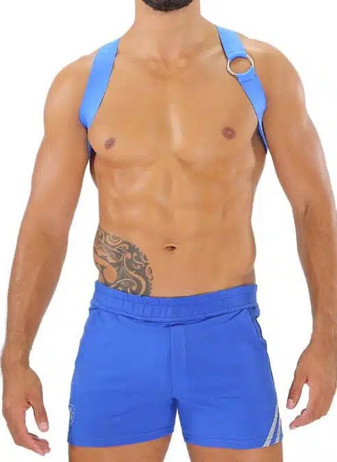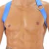This elastic harness is a classic item to play at home or when out clubbing. Consisting of a 3 cm wide elastic strap crossed in the back, and a metal ring detail on one side. This harness is made to show off your chest.